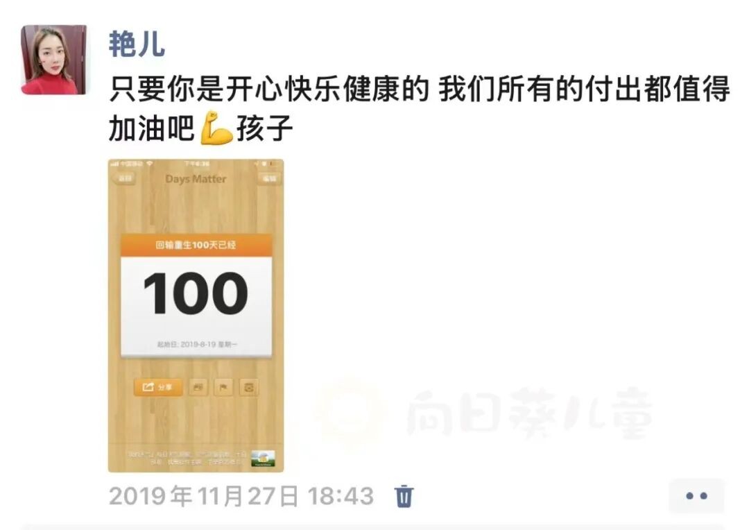 终于,熬过了仓内的艰难岁月,我们顺利出仓了。可我心里清楚,出仓只是造血干细胞移植的开始,“医生把孩子背过河,接下来的路还需我们自己走”,种子已经种下,生根发芽,经历风吹雨打,全靠后续的精心呵护了。我经常默念:用心护理,不能出差错。