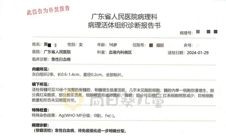 1月26号,妈妈独自去往医院,医生看了检查结果直接告诉她,小黄是白血病而且很危险,需要马上用药,让妈妈立即带孩子来医院进一步确诊。妈妈电话通知了正在出差的黄爸爸,立刻接小黄到医院,但并没告诉她病情。可当小黄被护士带去做骨穿时,医生的交谈证实了她对自己病情的猜测——急性髓系白血病