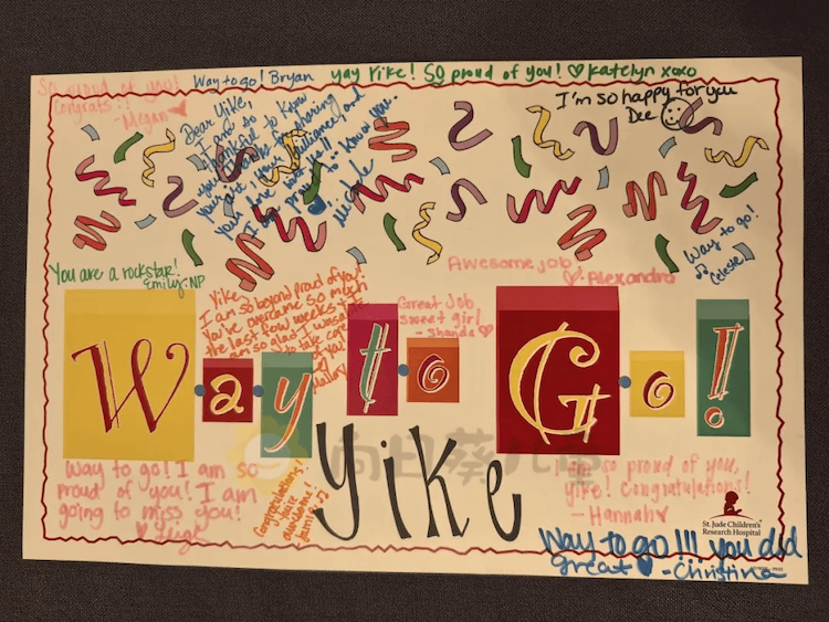黄妈妈说,虽然疾病本身并不美好,但是治病的种种经历是大多数人不可能经历的,这些都会成为今后人生的宝贵财富。比如小黄在这里读了很多因为上学没有时间和机会读的书,会跟接触到的美国人讲中国的文化、历史甚至安利了很多中国美食,她的绘画作品还被选中挂在圣裘德医院的走廊里展示,她参与圣裘德医院的“蓝天项目”提案获得董事会的肯定等等。