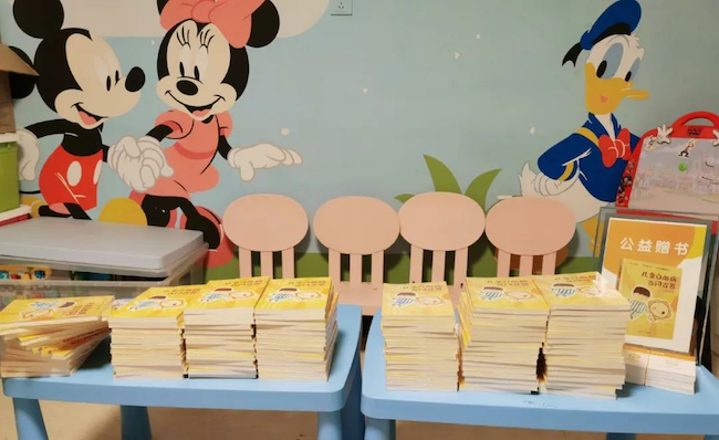 7月23日下午2点,向日葵儿童南区负责人夏欢和志愿者们提前到达院内的欢乐屋对赠书场地进行布置。