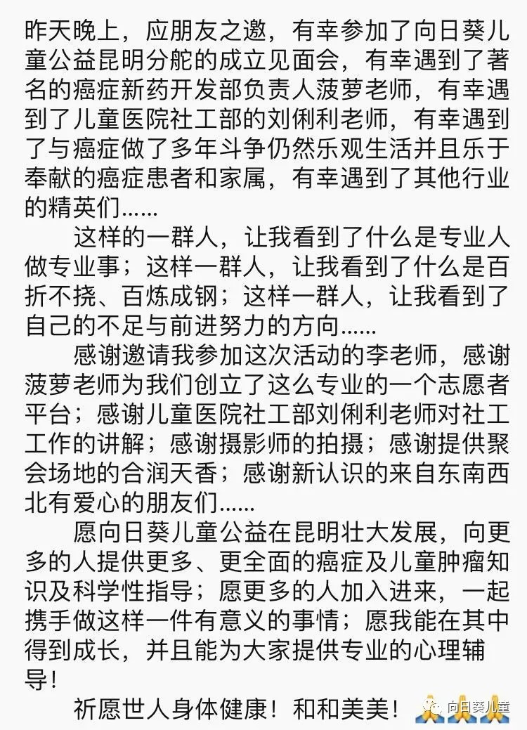“如果有一天,向日葵儿童公益走到你的城市时,真诚希望大家跟着菠萝参加他们的活动,为癌症儿童谋福利,让爱传递下去。”这是一位志愿者在朋友圈写的句子,向日葵以后还会在更多的城市举办活动,希望有更多的人加入我们。