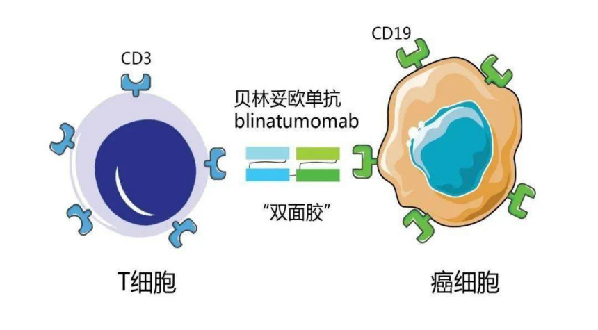 有个形象的比喻把贝林妥欧单抗叫双面胶。当贝林妥欧单抗连好了T细胞和肿瘤细胞,就可以产生溶解蛋白,释放炎性细胞因子,激活内源性T细胞,促进T细胞的增殖,导致CD19+细胞重新定向裂解。用过贝林妥欧单抗的家长,可能会觉得这些词都在检查单上见过,现在也可以理解为什么我们要做这些检查。