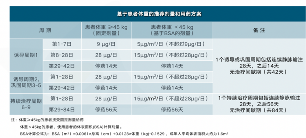标准用法是1个诱导或巩固周期包括连续静脉输注28天,之后14天停药间歇;1个持续治疗周期包括连续静脉输注28天,之后56天停药间歇。
