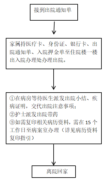 办理出院:患者收到出院通知后,到护士站领取出院通知单,办理完出院手续及医护人员交代出院注意事项后即可出院。流程如下图: